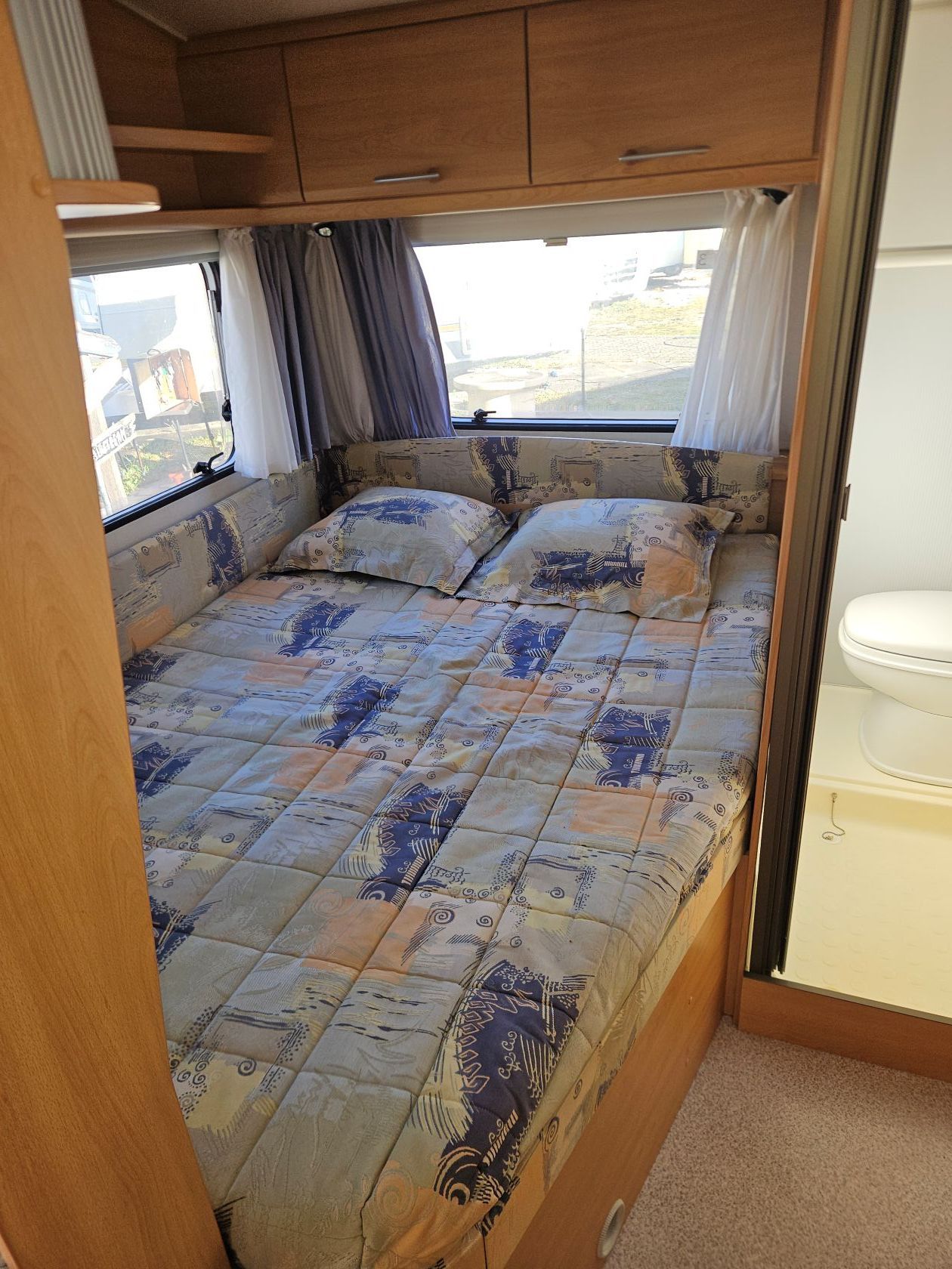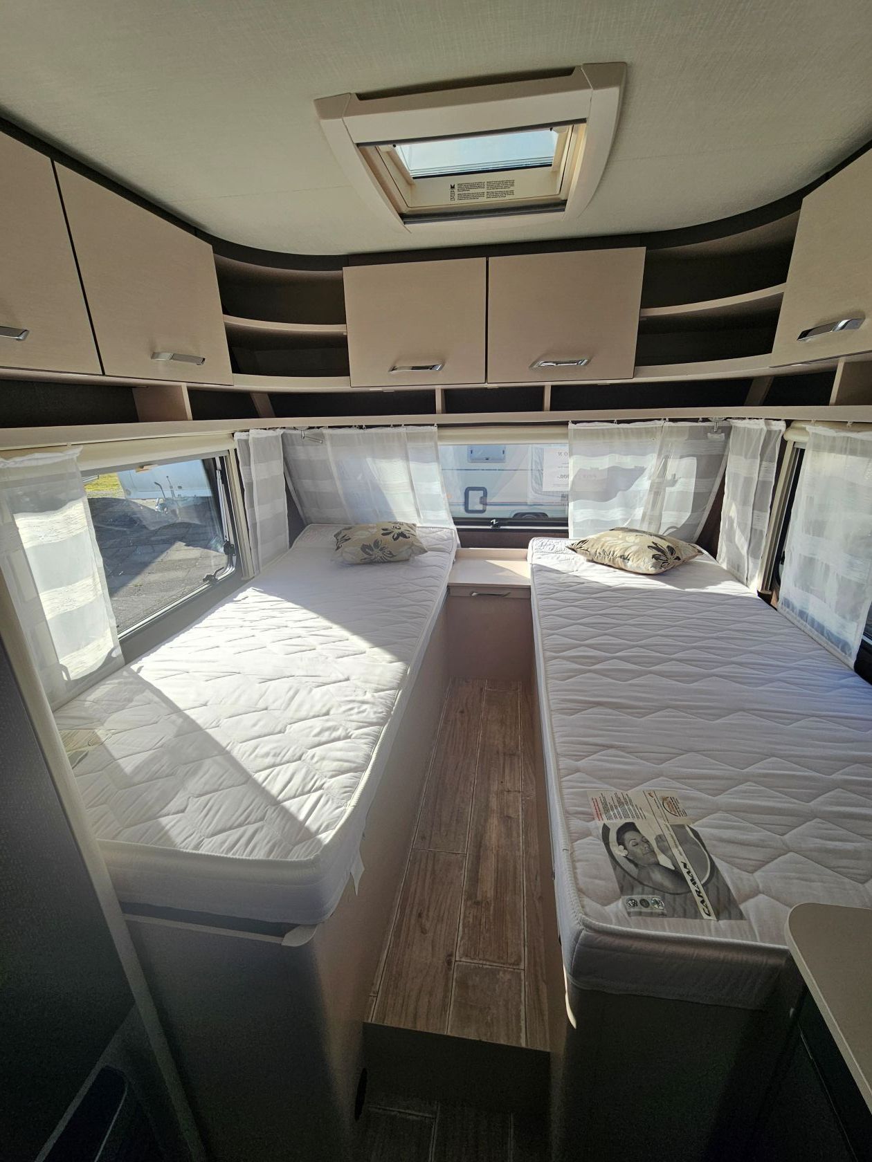 Description : un grand espace repas transformable en lit 2 places et un lit français deux places avec grand coffre en dessous également accessible depuis l'extérieur et deux lits superposés.
