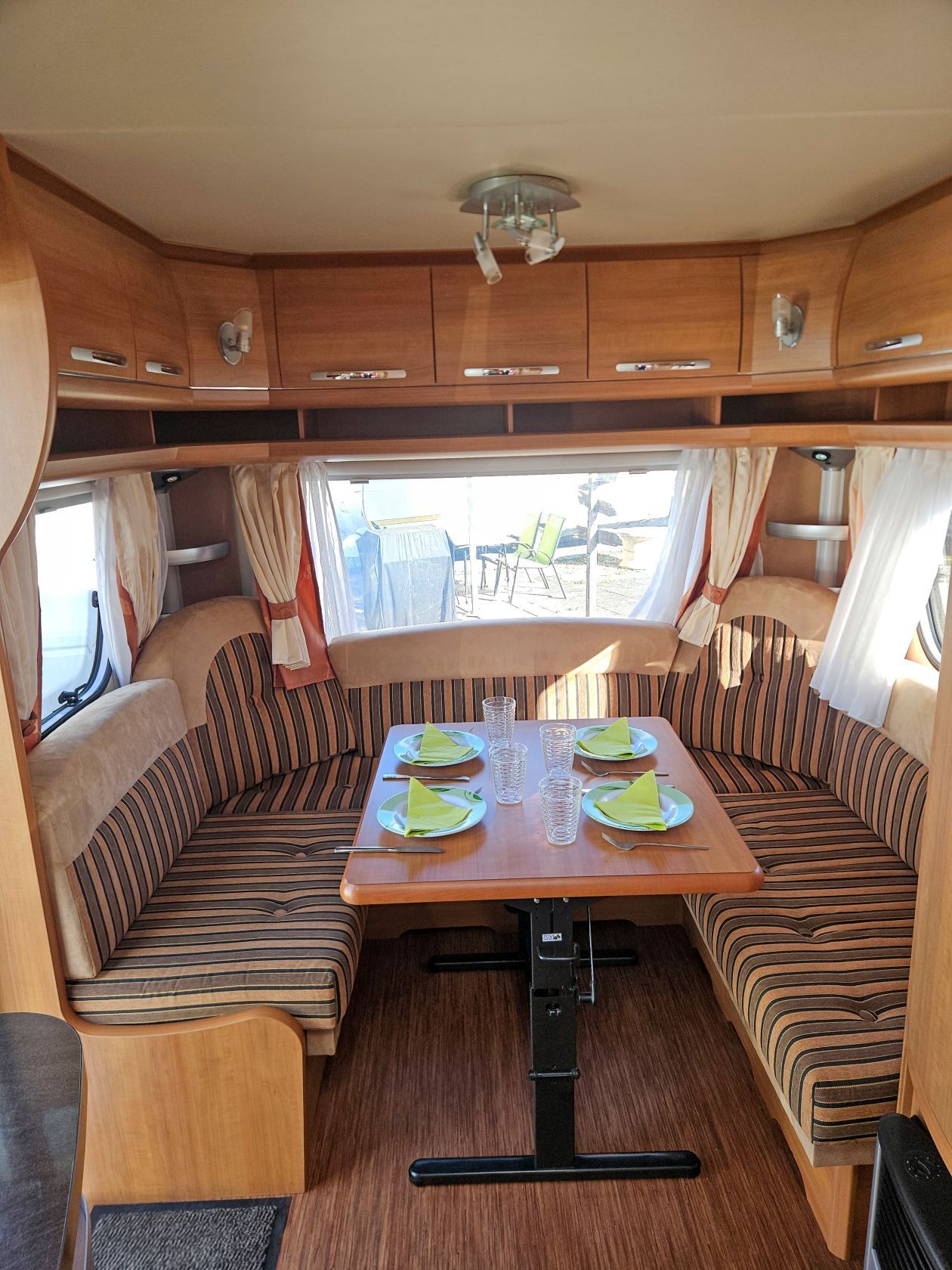 Description : un grand espace repas en U transformable en lit deux places et un lit francais avec grand coffre en dessous également accessible depuis l'extérieur.