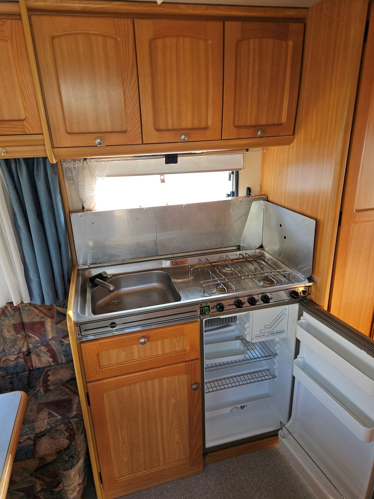 Equipement : gazinière 3 feux + 1 feu électrique, évier inox, frigo-congélateur 12V-gaz-220 capacité de 155 l, combinaison four/grill. chauffage HALDE, climatisation.