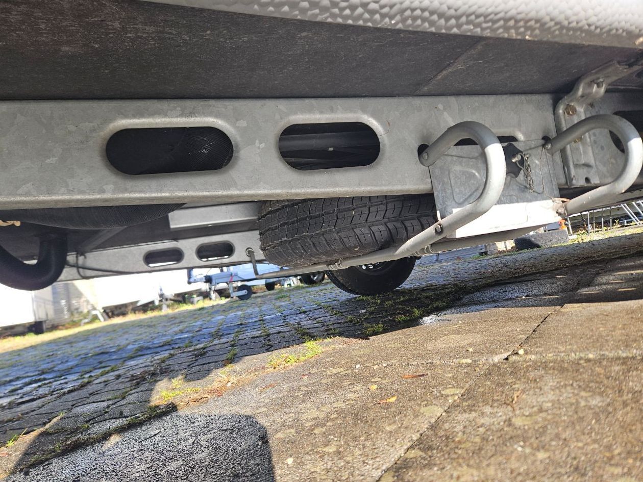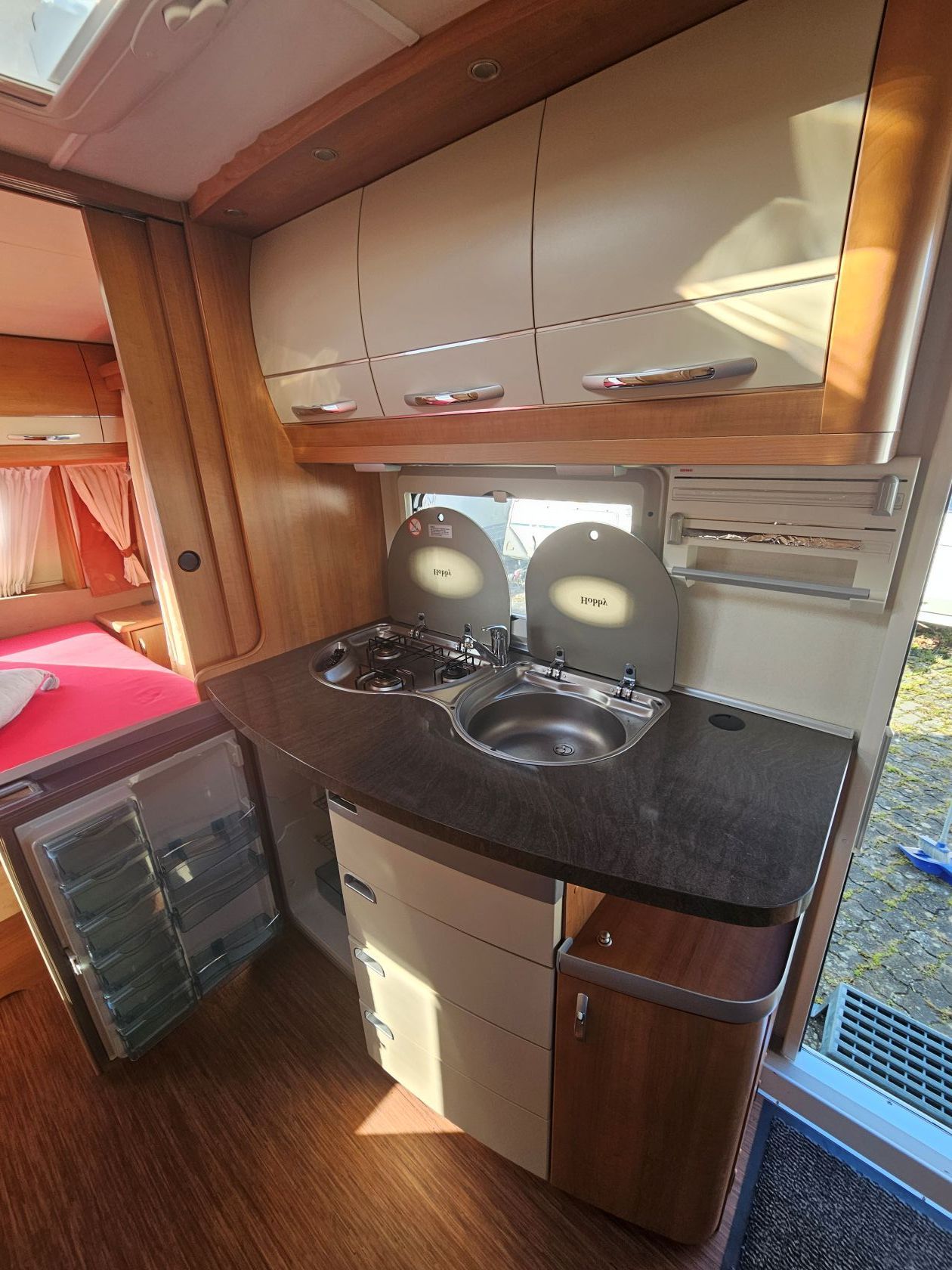 Equipement : gazinière 3 feux, évier inox, frigo-congélateur 12V-gaz-220V. Système Truma combiné chauffe-eau/chauffage. TV et prise TV extérieure. Porte moustiquaire complète.