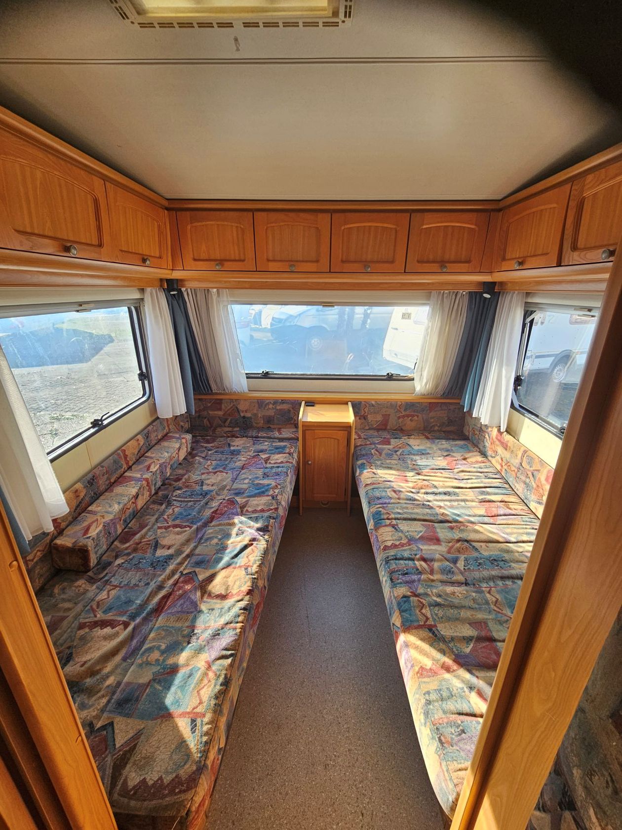 Description : un espace repas pour quatre personnes transformable en lit deux places, deux lits séparés avec grand coffre en dessous accessible.