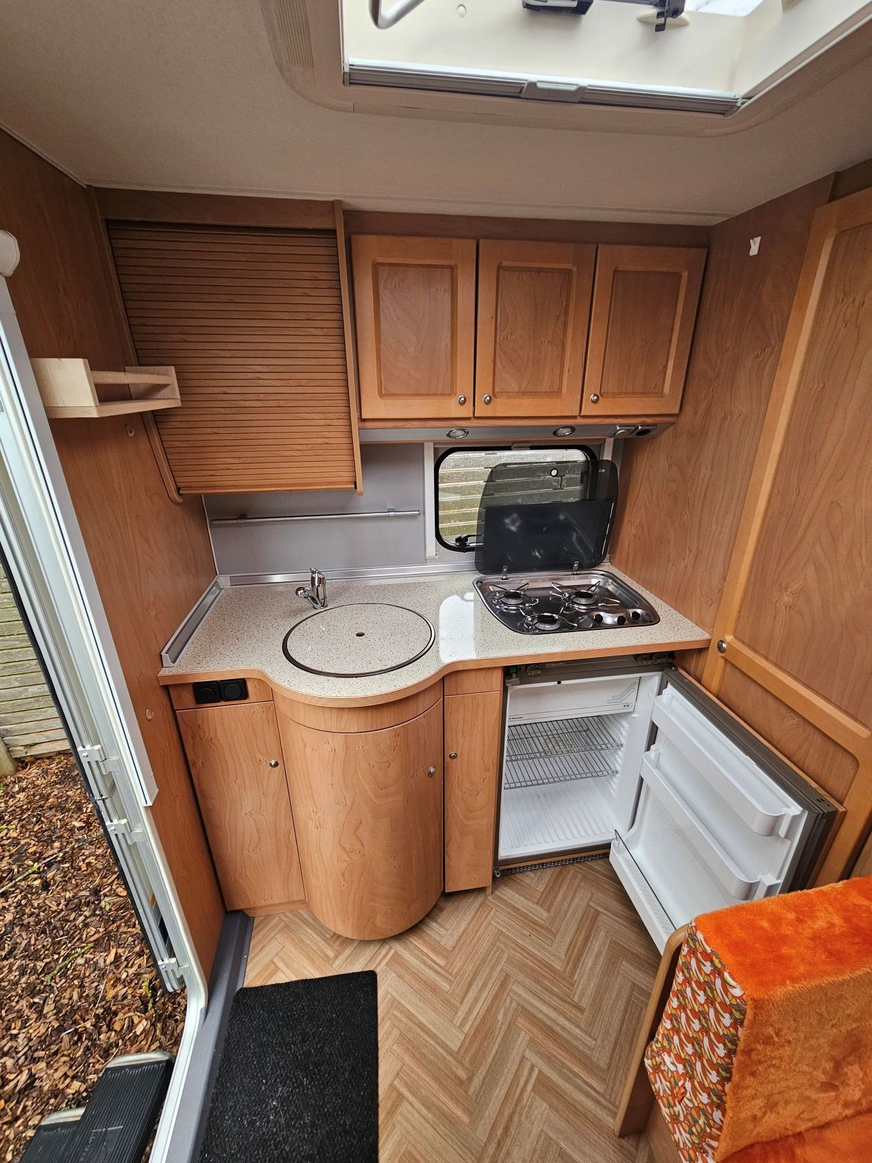 Cuisine avec évier inox, cuisinière trois feux, frigo-congélateur 12V-gaz-230V. Chauffage Trumatic et chauffe-eau Trumatherm.