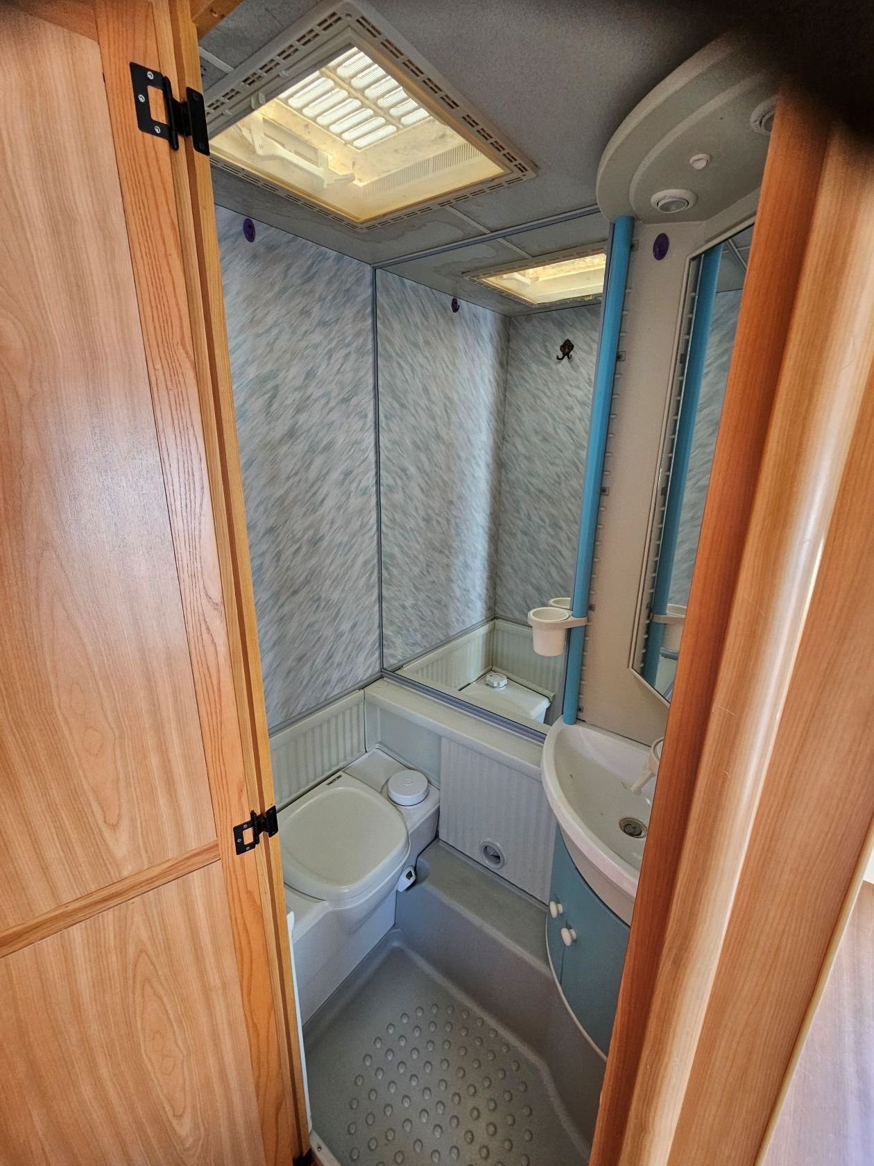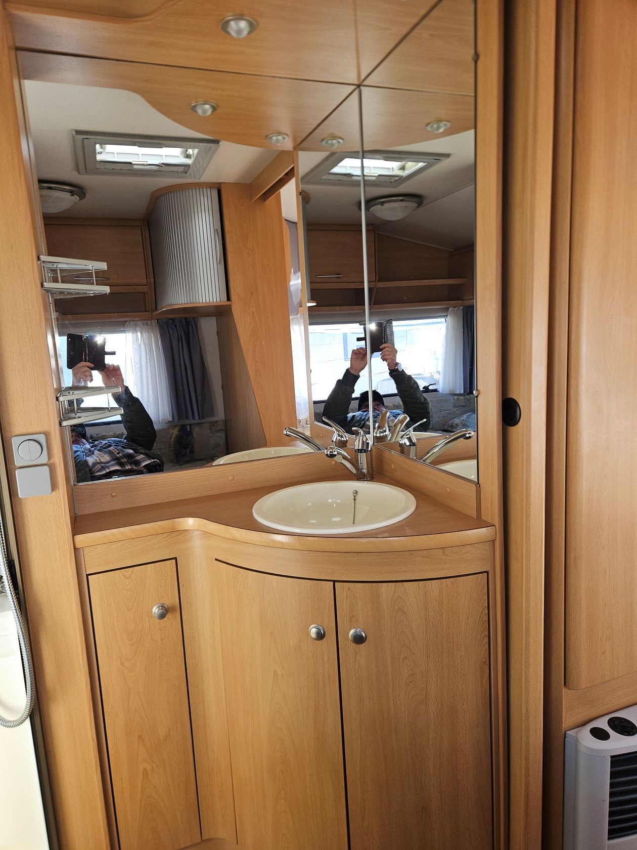 Cuisine avec gazinière trois feux et évier inox. Frigo 12v-gaz-230v. Salle de bain avec WC encastré et DOUCHE. Lavabo à l'extérieur. Deux réservoirs d'eau d'une contenance totale de 120 l. Chauffe-eau Truma et chauffage Trumatic à air pulsé.