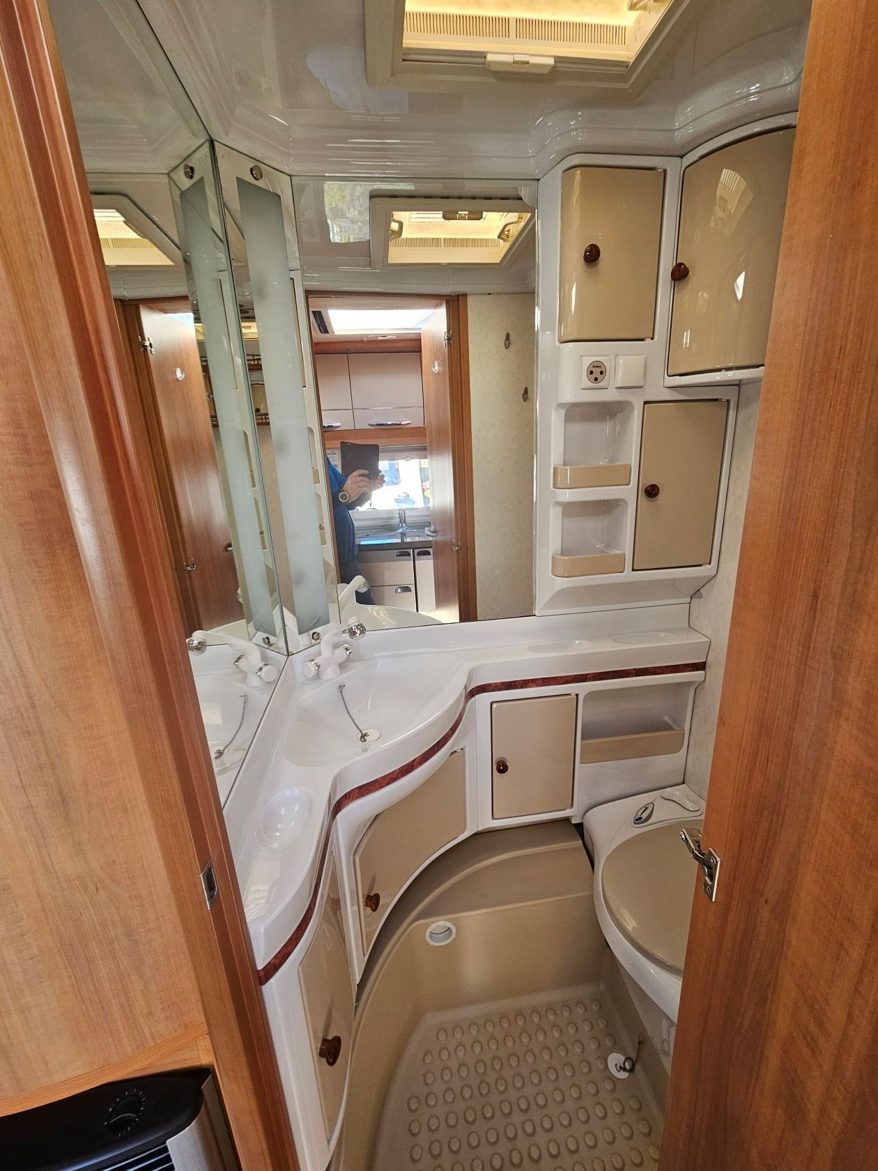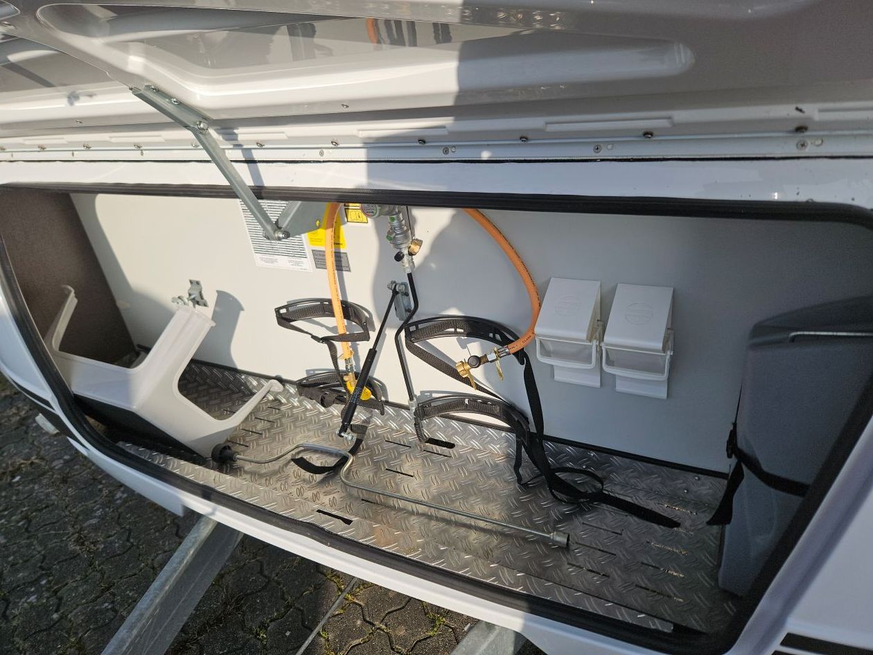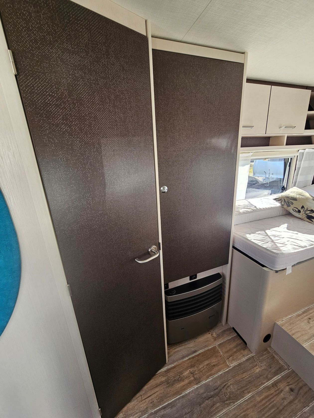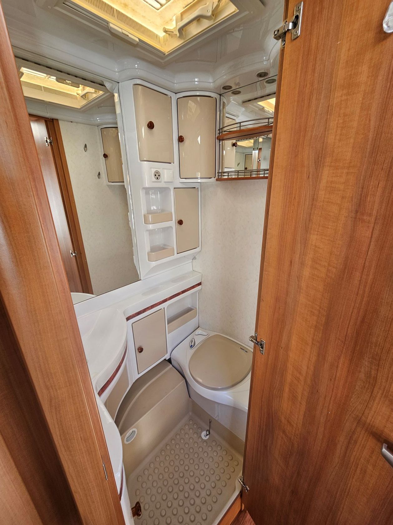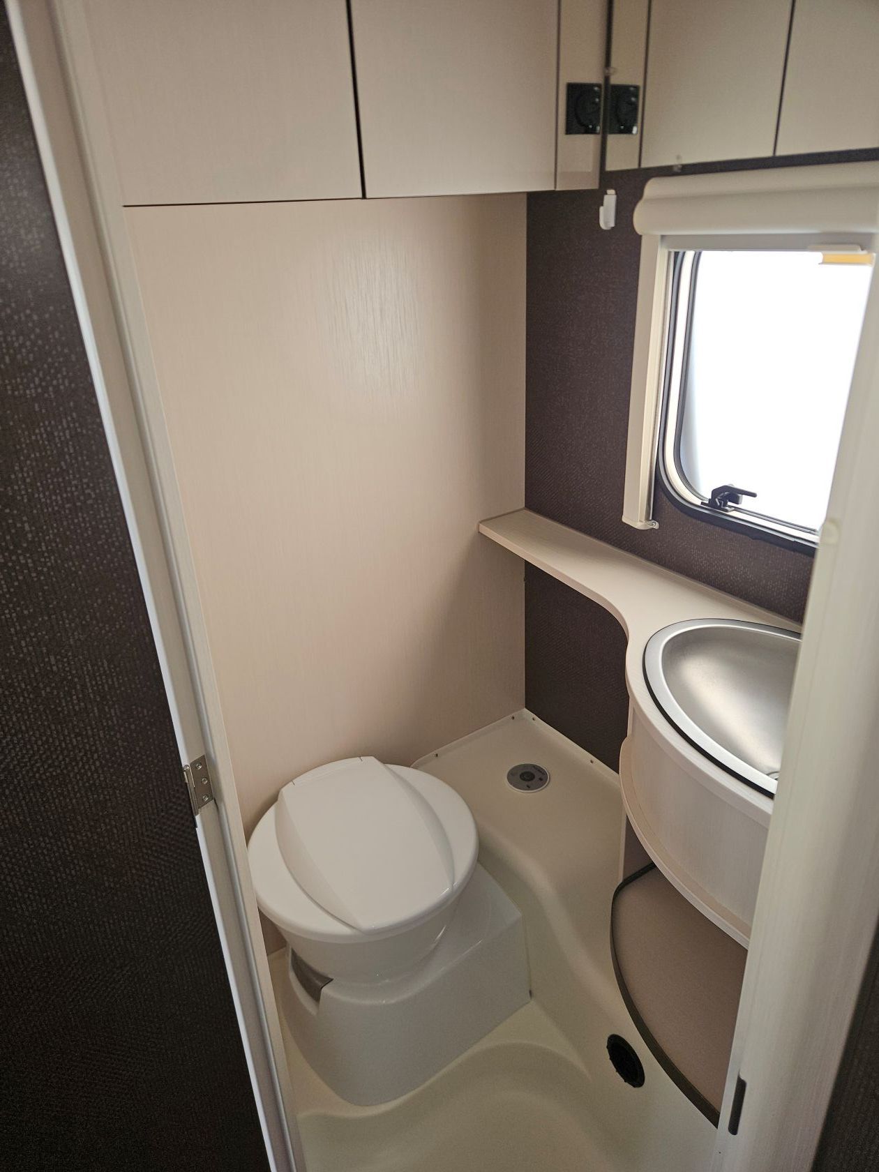Salle de bain avec WC pivotant, lavabo et douche. Chauffage Trumaticà air pulsé et chauffe-eau Trumatherm 5 l. Réservoir eau claire 50 l. Porte entrée avec grand moustiquaire.