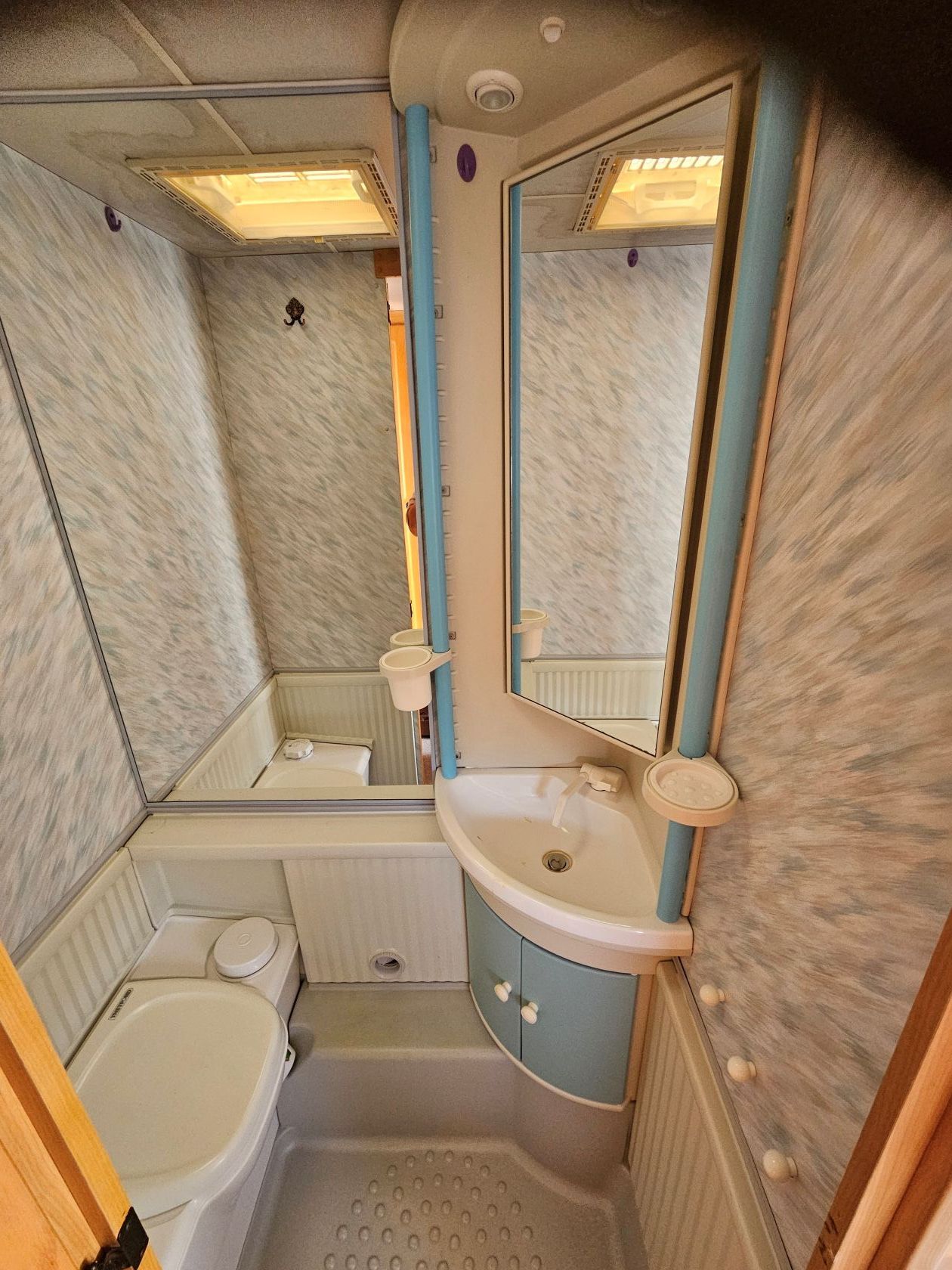 Salle de bain avec WC pivotant et cabine de douche, chauffage Trumatherm, chauffe-eau Trumatherm 5 l. Réservoir eau claire 60 l.