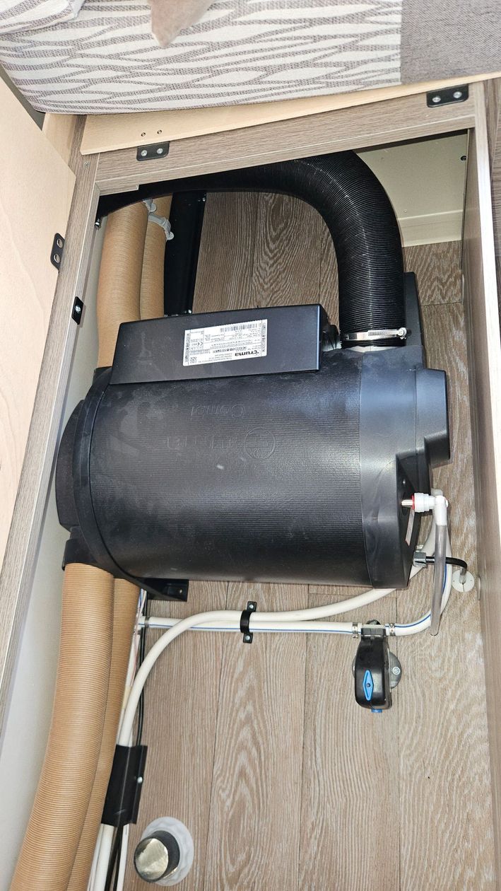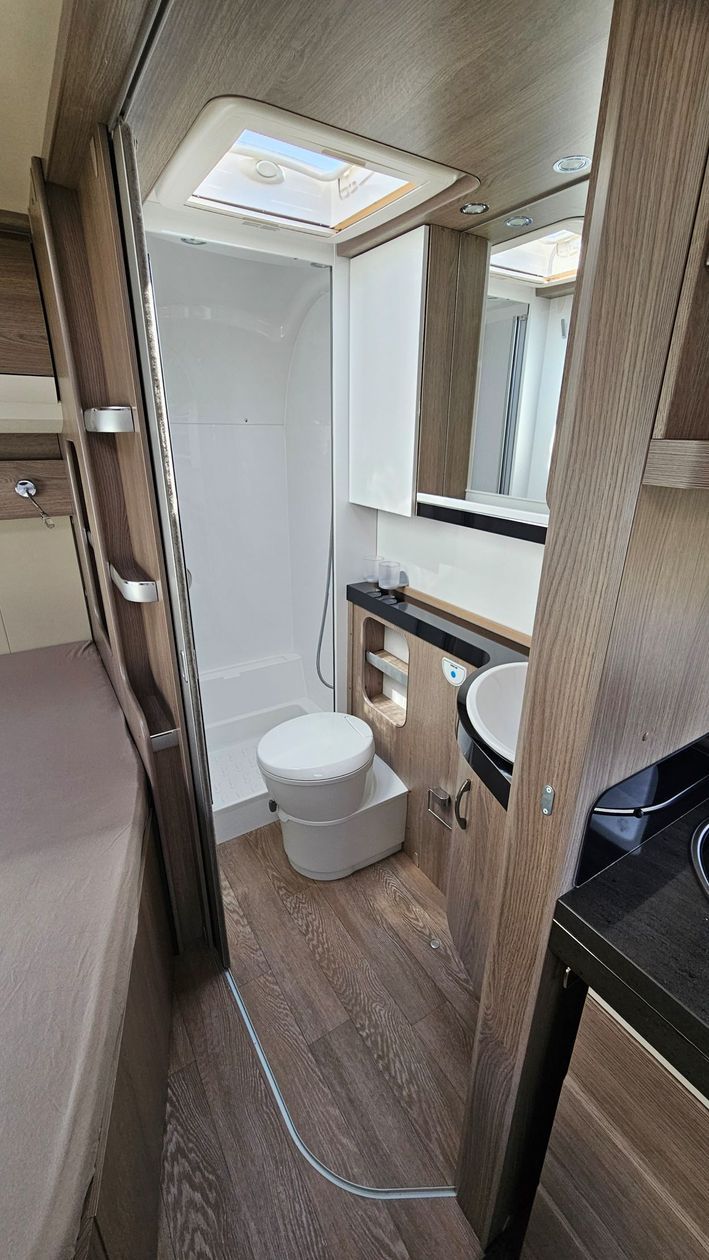 Cuisine avec évier inox, cuisinière trois feux, frigo-congélateur 12V-gaz-230V. Chauffage à air pulsé. Salle de bain avec WC intégré et lavabo. Réservoir eau propre de 20 l.