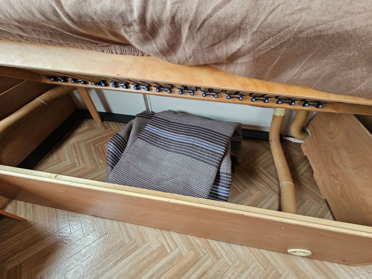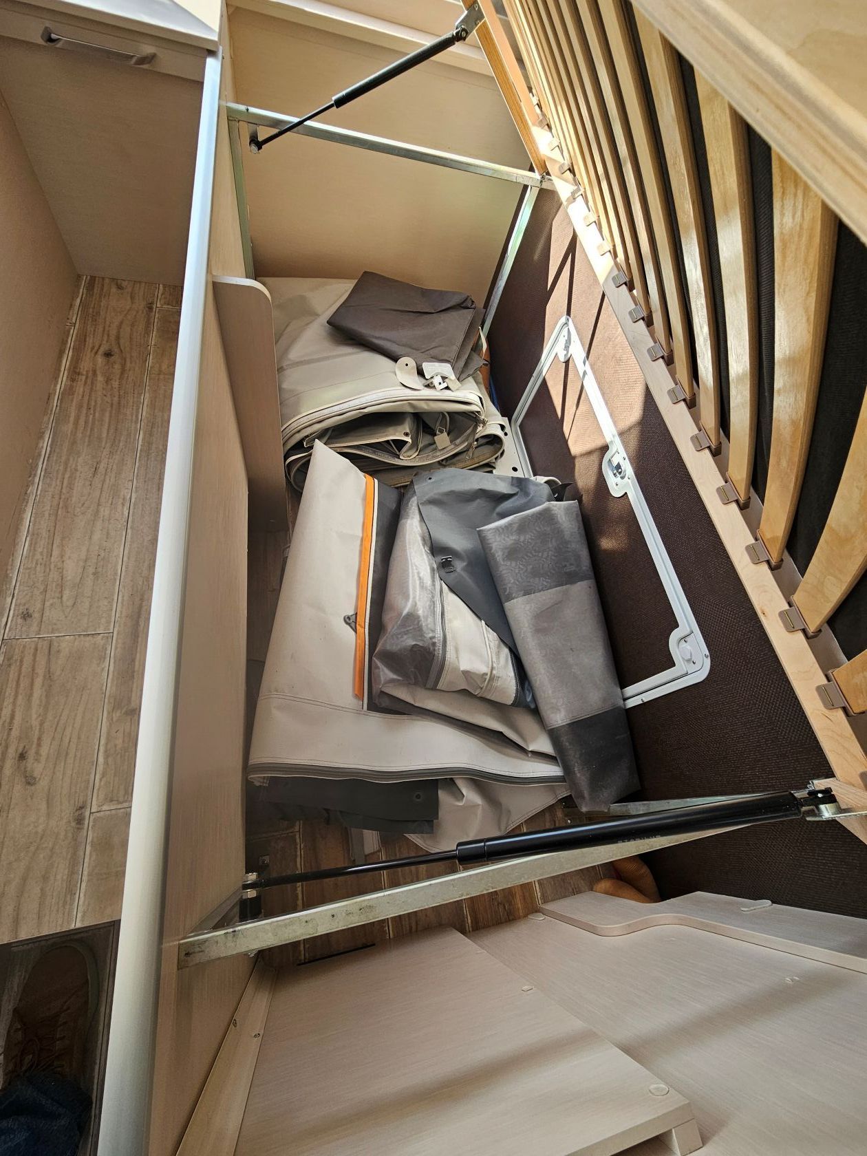 Description : un espace repas transformable en lit une-deux places et un lit français avec sommier à lattes. Grand coffre sous le lit accessible également depuis l'extérieur.