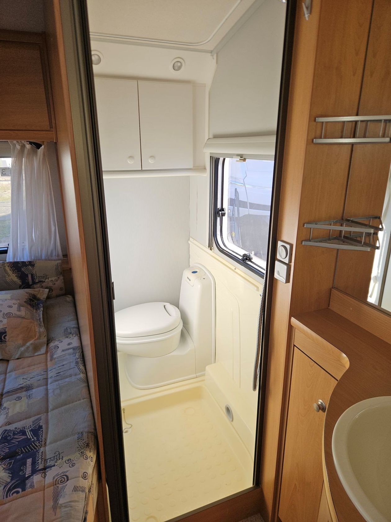 Cuisine avec évier inox, cuisinière trois feux, frigo-congélateur 12V-gaz-230V. Chauffage Trumatic à air pulsé. Belle salle de bain avec WC pivotant, lavabo, cabine de douche, Chauffe-eau Trumatherm 5l. Réservoir eau 50 l.