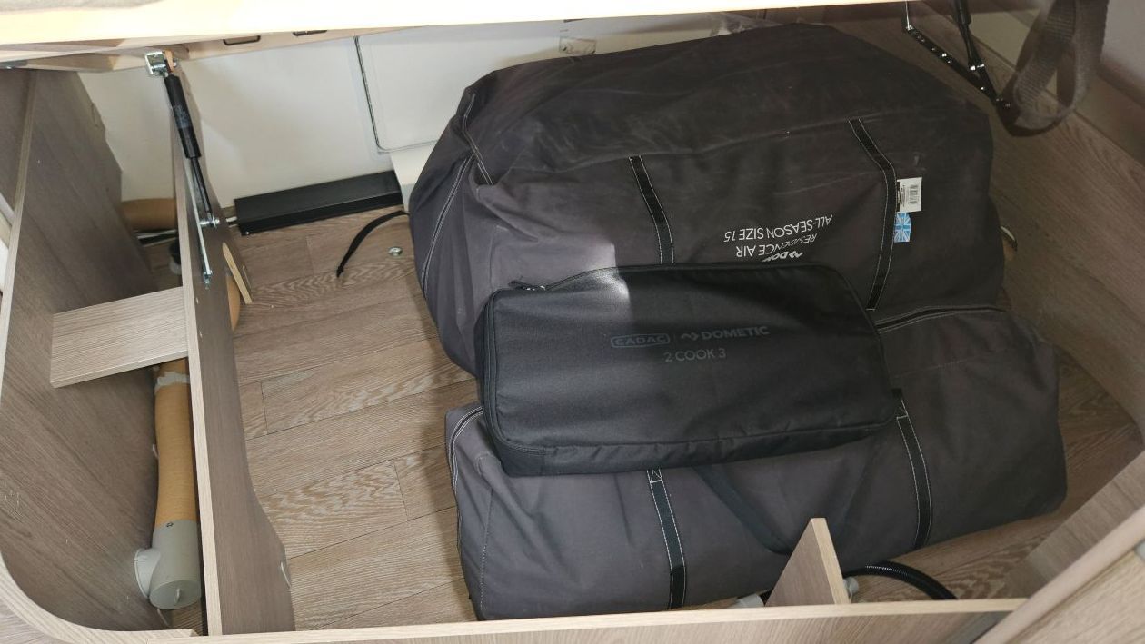 Description : un grand espace repas un U transformable en lit deux places, un lit transversal pour deux personnes avec grand coffre en dessous accessible également depuis l'extérieur.