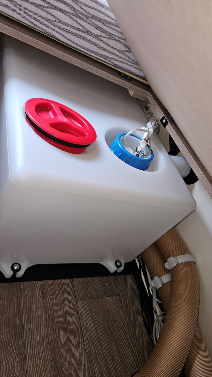 Salle de bain avec WC fixe et lavabo. Chauffage Trumatic à air pulsé. Chauffe-eau Trumatherm 5 l. Réservoir d'eau de 50 l.